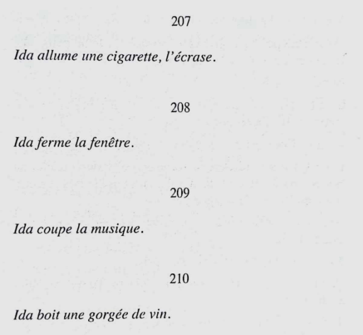 The play, whose progression of action is continuous (no flashbacks, no ellipses), is divided into numbered micro-sequences (two hundred and twenty in total). Each of them reports a short and unique action, with different typography styles depending on the action reported. When Ida’s physical actions are described, the micro-sequence take the form of a stage direction:
