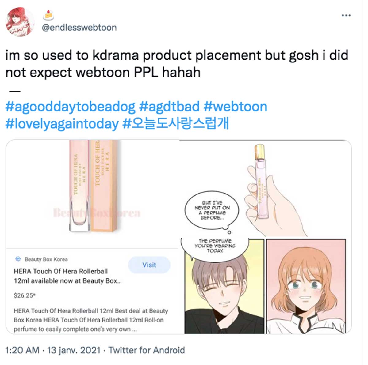 The wheels of adaptation success have since been in motion. Webtoons are gaining ever more popularity, becoming less and less confined to the platforms they are read on, and expanding across media. The adaptations of webtoons on (big or small) screens is exponentially growing, successful webtoons are being physically published or adapted into video games. Moreover, webtoons are also used as promotional materials. It can be the case that a specific webtoon is created to promote a company or product (called ‘Brand webtoon’), as Samsung did with the webtoon (and its web-drama adaptation) Infinite Power (Joo, 2012). In this webtoon, we follow the journey of a character trying to become an employee at the conglomerate. The idea was not only to explain the hiring process, but also to promote the company’s values (Kang, 2017: 768). Similarly, the disaster webtoon 2024 (Lee and So, 2014-2015) was backed by the Korean Hanwha Insurance Company. The webtoon depicts a natural disaster and the insurance company eventually guiding people and saving the day (Lee, Park and al, 2019: 5). Webtoons as promotional materials can also exist by having product placement within the webtoon – not unlike practices common in K-dramas (see fig. 3). Another way to use those comics as promotional materials is by developing partnerships between brands and famous webtoons. For example, characters of The Sound of Your Heart (Jo, 2014-2020) were used in a partnership with cosmetic brand SNP (see fig. 4).