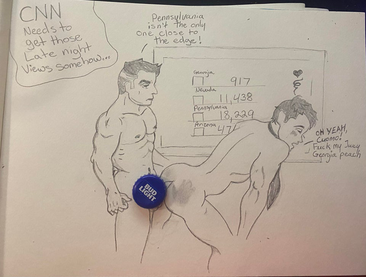 Andere gebruikers beginnen verzoekjes te posten. “In any Cuomo fanfic one of y’all writes”, vraagt brilliant0ne, “can you make Cuomo say ‘Key Race Alert’ right before he cums?” “Where does Phil fit in all of this?” wil een Map Boy-fan weten. “Hopefully inside Cuomo”, antwoordt brilliant0ne. De boel escaleert nog verder in thread 34—niet verbazend, aangezien Rule #34, een oude wet van het internet, als volgt luidt: “if it exists, there is porn of it”. Thread 34 begint bijgevolg met commentaren als “Bring forth the porn”, “Thread 34, mark this one NSFW mods, it’s gonna get weird”, “Chris Cuomo r34 with the map guy please” en “This thread is now exclusively for sexxxy fanfic about CNN personalities”. En Rule #34 stelt niet teleur: om 5u50 post RottingSextoy de eerste fan art van Map Boy and Cuomo.